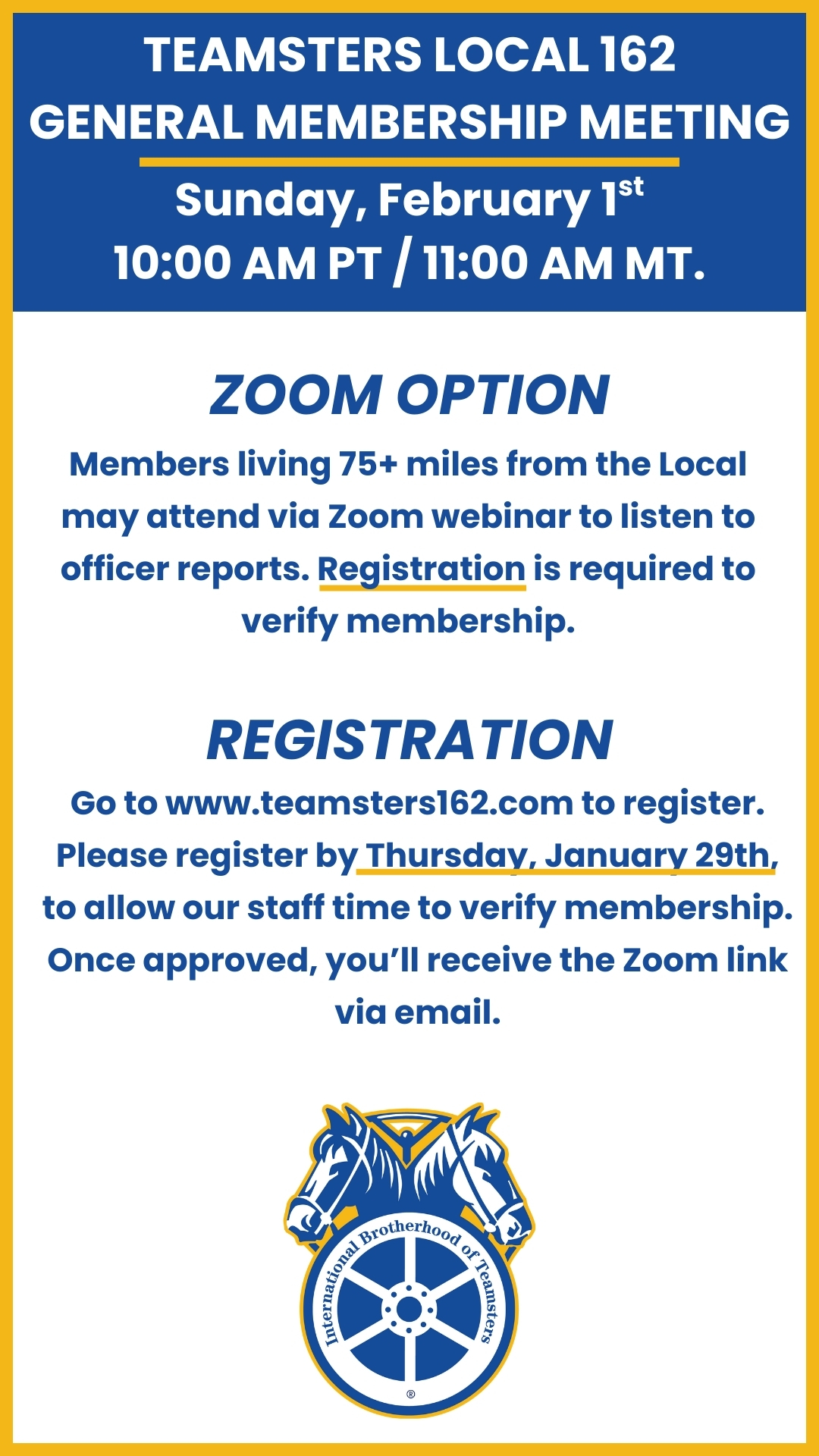 Teamsters Local 162 – February General Membership Meeting The Teamsters Local 162 January General Membership Meeting will be held on Sunday, February 1st, at 10:00 AM PT / 11:00 AM MT, at Joe Edgar Union Hall in Portland, OR. For members who are 75+ miles away from the Local, you may join via zoom to hear reports of Officers.